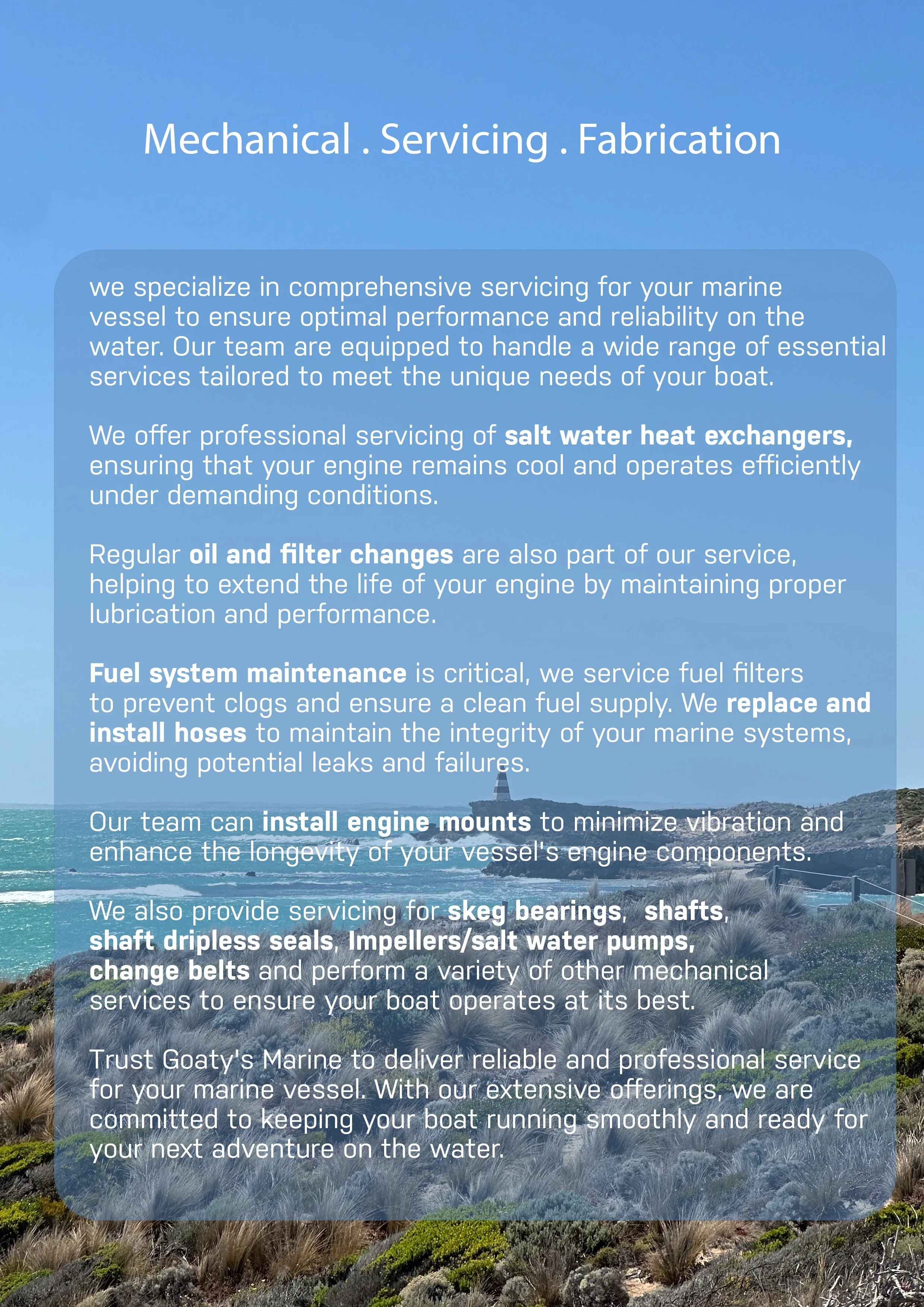Goaty’s Marine brings together over 40 years of experience in electrical engineering, mechanical and boatbuilding to deliver a servicing solution for motor cruisers, race yachts, fishing trawlers, passengers ferries and everything in between.